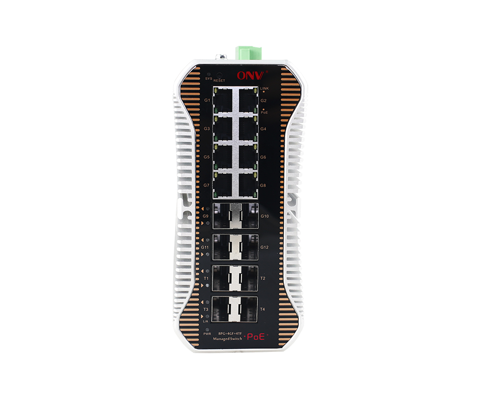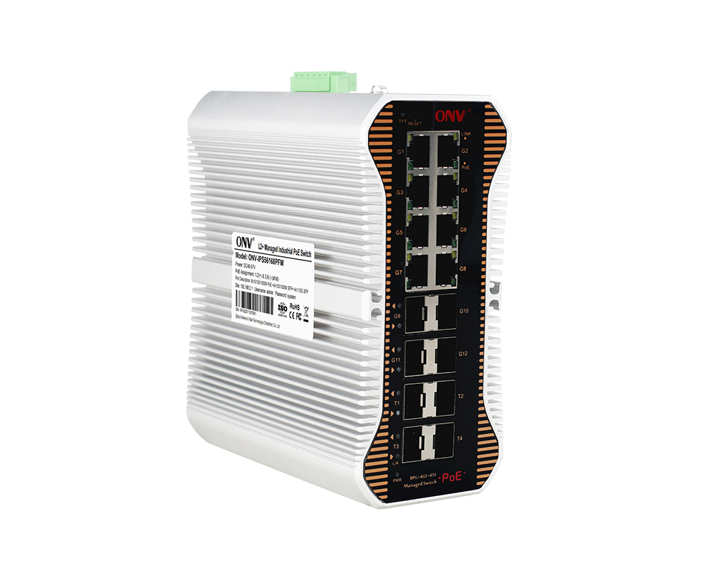 ONV-IPS56168PFM系列是ONV自主研发的万兆上联三层网管工业POE光纤交换机,支持8个10/100/1000Base-T自适应RJ45端口+4个100/1000Base-X SFP光口插槽+4个1/10G 万兆SFP+光口插槽。其中1-8端口支持IEEE 802.3af/at标准PoE供电,单端口PoE功率达30W。作为PoE供电设备,能自动检测识别符合标准的受电设备并通过网线为其供电。可通过网线为无线AP、网络摄像头、网络电话机、工业传感器等POE终端设备供电,满足对高密度PoE供电有需求的网络环境,适合智能交通、轨道交通、电力行业、矿业开采、石油、海运、冶金及绿色能源建设等工业场景组建经济高效、稳定、可靠的通信网络。